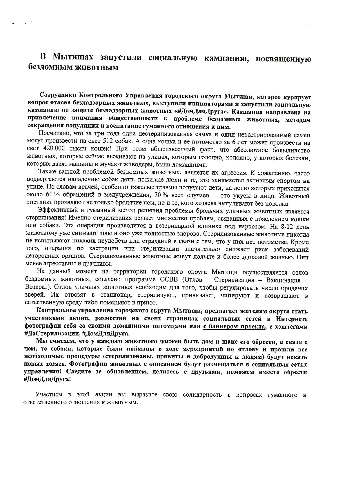 В городском округе Мытищи запущена социальная кампания по защите безнадзорных животных "#ДомДляДруга"