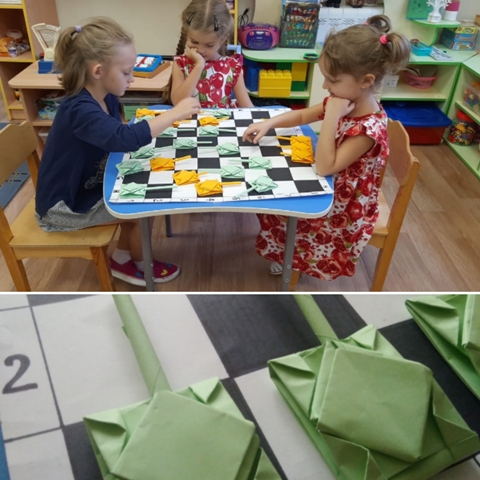 Шашечный турнир или танковое сражение? Родители воспитанников подготовительной группы МБДОУ 69 "Золотой ключик" городского округа Мытищи предложили выполнить фигуры для игры в виде танков в технике оригами. Юные леди тоже присоединились к игре